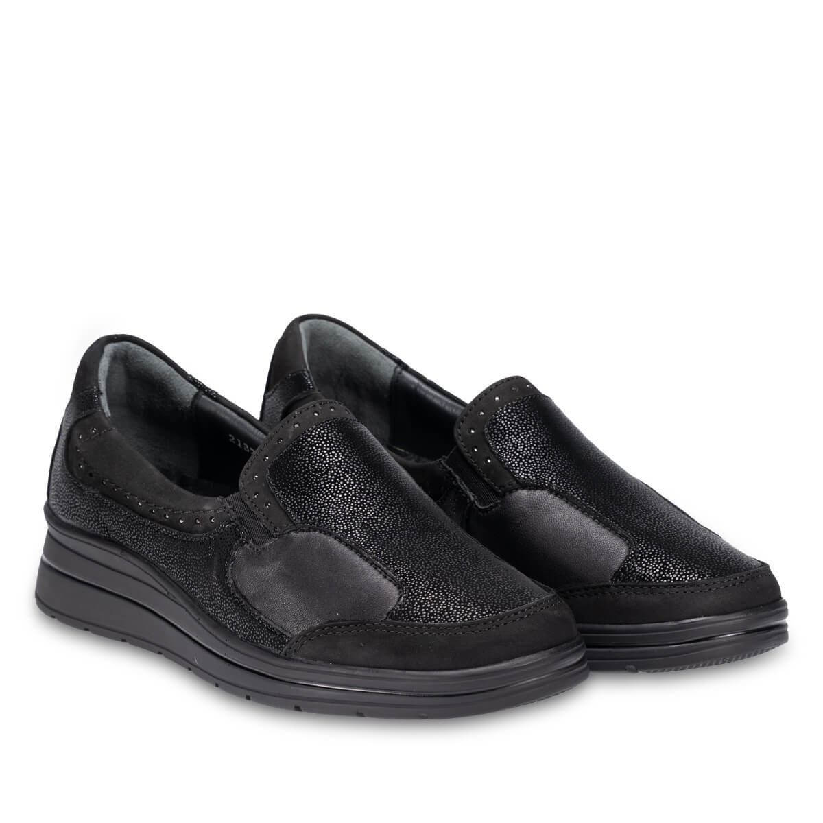 Hafif poliüretan taban ve 4 cm dolgu topuk, dengeli yürüyüş ve rahat duruş sunarken bağcıksız tasarım, kolay ve pratik kullanım sağlar. Siyah rengiyle her kombine uyum sağlayarak klasik ve zarif bir stil kazandırır.
