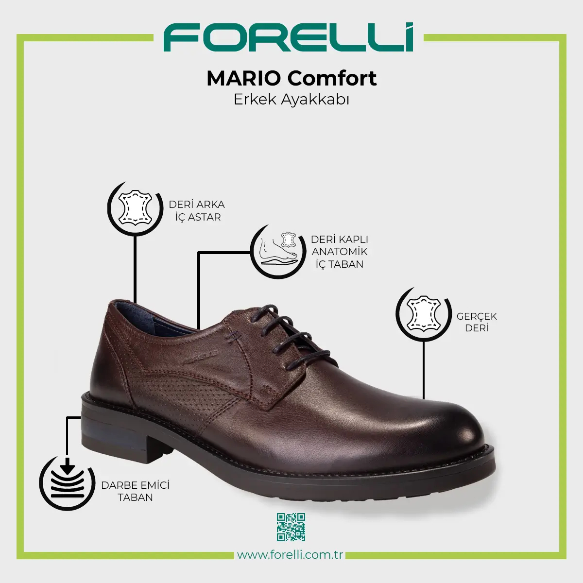 %100 doğal deri üst ve astar malzemesi ile klasik ve şık bir görünüme sahiptir. Çıkartılabilir anatomik deri iç tabanı uzun süreli konfor sağlar. Poliüretan tabanı dayanıklı ve hafif olup 3,5 cm’lik topuk yüksekliği ile günlük kullanıma uygundur. 40–45 numara arası G – Standart kalıp seçenekleri ile rahat bir uyum sunar. Bağcıklı tasarımı sayesinde ayağa tam oturur ve güvenli bir kullanım sağlar.