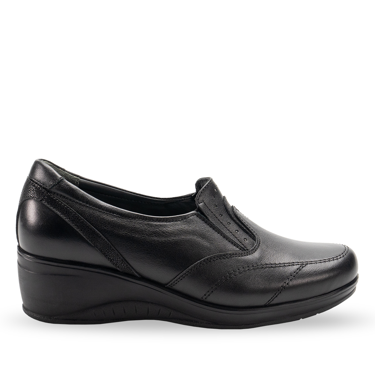 5 cm dolgu topuk, günlük kullanımda şıklık ve konforu dengeler. Bağcıksız tasarım, kolay giyip çıkarma ve sade bir şıklık sağlar.