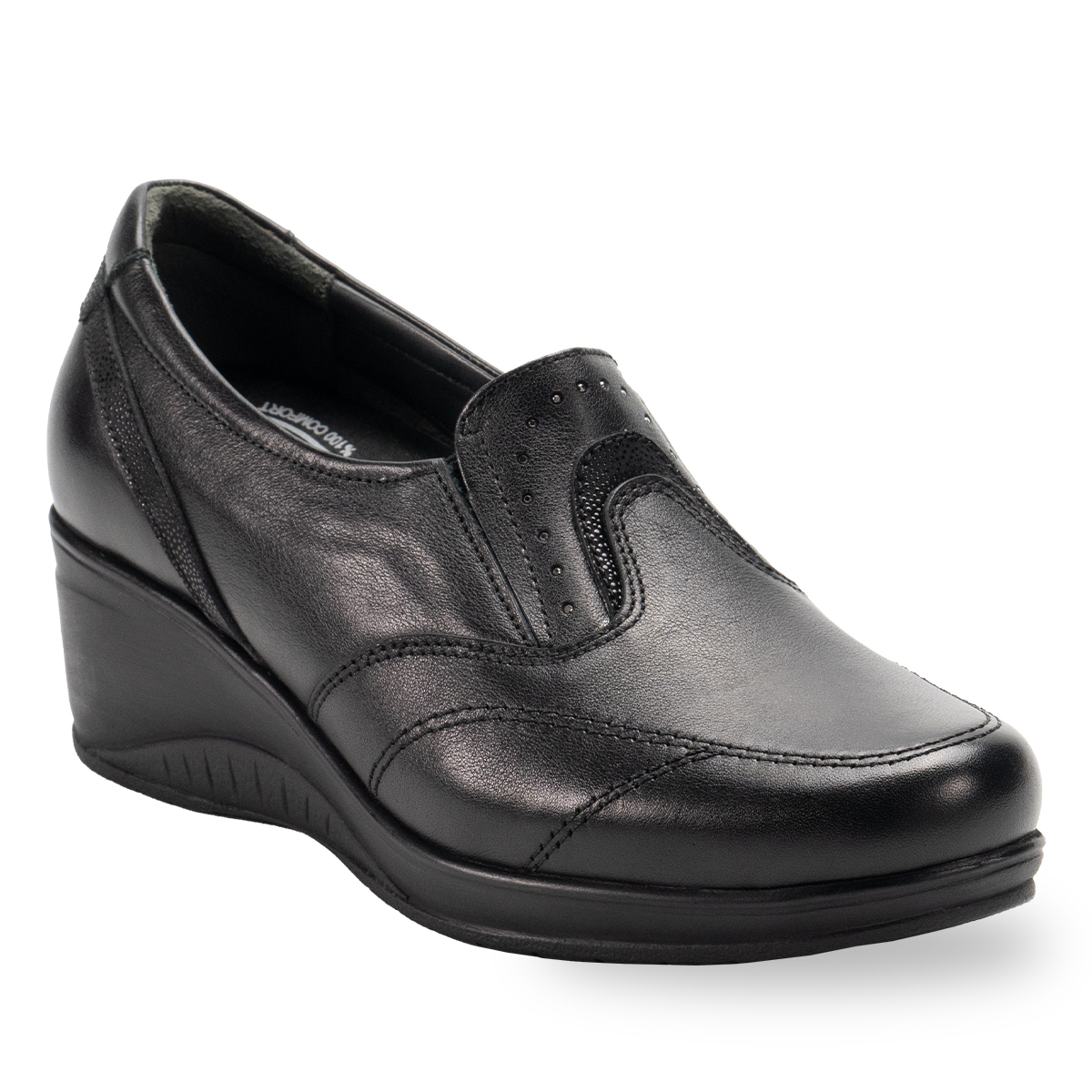 İç tabandaki çıkartılabilir anatomik latex fuspet, ayağı sarar ve gün boyu konfor ve destek sağlar. Poliüretan taban, hafif, esnek ve darbe emici yapısıyla güvenli adımlar sunar.