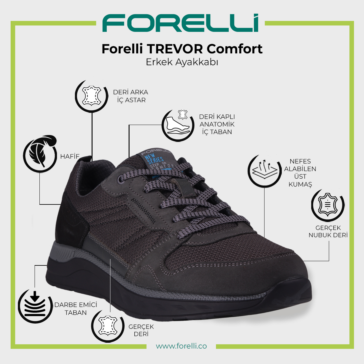 TREVOR-G, şıklığı ve günlük rahatlığı bir araya getiren erkek ayakkabısıdır. Üst kısmında %35 deri ve %65 tekstil kullanımı, ayakkabıya hem modern bir görünüm hem de nefes alabilirlik kazandırır. %5 deri ve %95 tekstil karışımı astarı ve çıkarılabilir memory fuspet iç tabanı, ayağın şeklini alarak uzun süreli konfor sağlar.